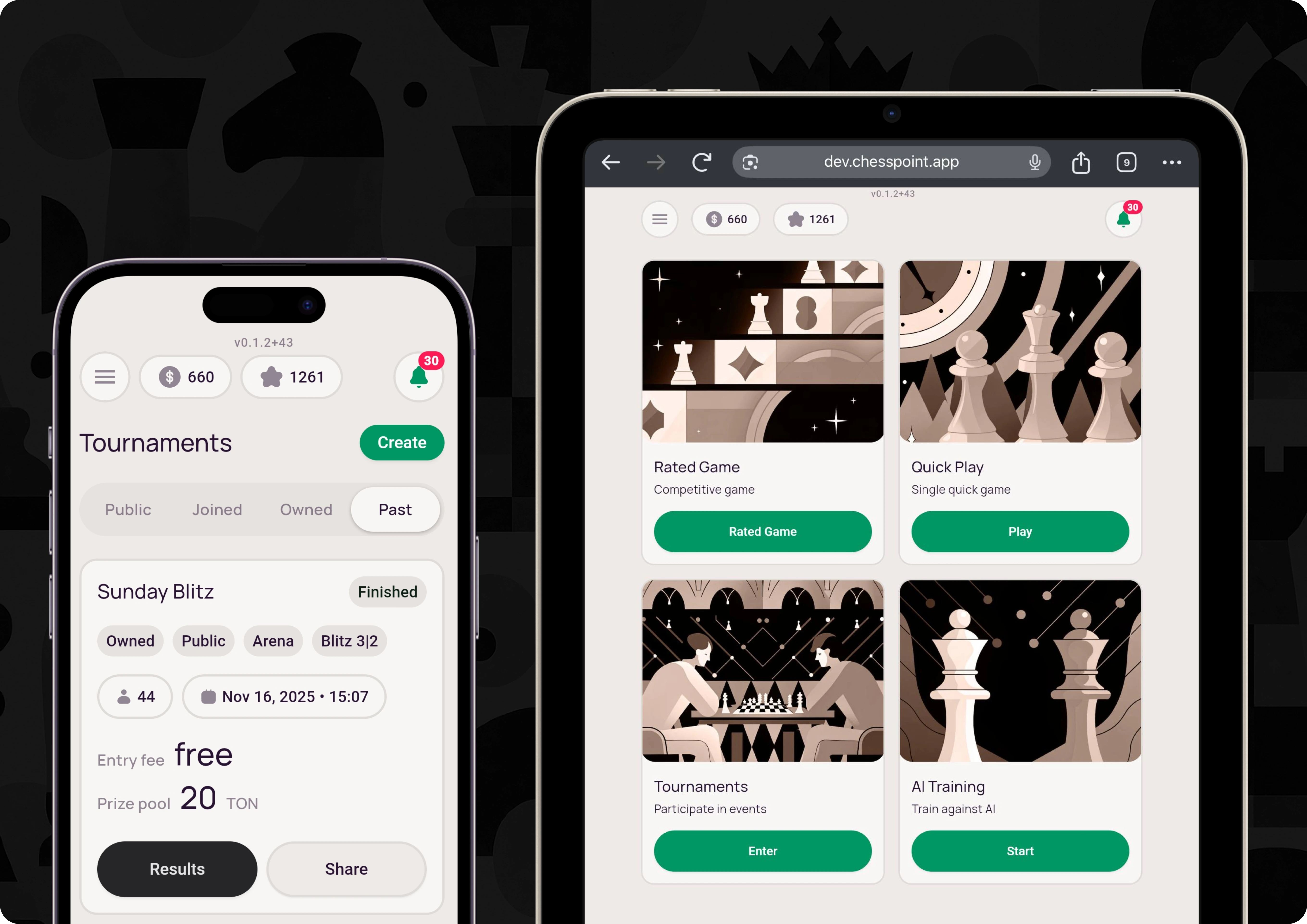More tournament formats and rating brackets, smoother Telegram Mini App integration, enhanced smart-contract payouts, and Web3 community features - including quests, rewards, and puzzle challenges.